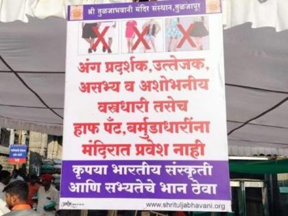 श्री तुळजाभवानी देवीच्या दर्शनासाठी महाराष्ट्रातूनच नव्हे तर देशाच्या कानाकाेपऱ्यातून भाविक माेठ्या संख्येने येत असतात. त्यामुळे केवळ यात्राेत्सव काळातच नव्हे तर एरवीही इथे गर्दी असते. देवीच्या दर्शनासाठी येताना अंगावर काेणत्या स्वरूपाचे कपडे परिधान करायला हवेत, याबाबत कुठलेही नियम वा बंधने यापूर्वी नव्हती. मात्र, नुकतेच मंदिर संस्थानच्या वतीने काही बदल करण्यात आले आहेत. जे भाविक अंग प्रदर्शक, उत्तेजक, असभ्य, अशाेभनिय (वेस्टर्न) तसेच हाफ पॅन्ट व बरमुडा परिधान करून येतील, त्यांना श्री तुळजाभावानी देवीच्या दर्शनासाठी मंदिरात प्रवेश दिला जाणार नाही. निर्णयाची चाेख अंमलबजावणी व्हावी, यासाठी तातडीने मंदिर परिसरात याबाबतचे फलकही लावले आहेत. गुरूवारपासून या निर्णयाची प्रत्यक्ष अंमलबजावणीही सुरू झाली आहे.