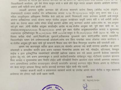 दरम्यान, मराठा समाजाच्या प्रश्नाकडे शासनाचे लक्ष वेधण्यासाठी मराठा क्रांती मोर्चा गुरुवारी १७ सप्टेंबरला पुणे जिल्हाधिकारी कार्यालयावर मोर्चा काढणार आहे. मोर्चातील प्रमुख कार्यकर्त्यांना पोलिसांनी नोटीस बजावली आहे.त्यात त्यांनी शहरात ३७ (३) प्रमाणे पाच किंवा पाच पेक्षा जास्त लोकांचा जमाव करण्यास पोलीस आयुक्तांच्या पूर्व परवानगीशिवाय बंदी घातली आहे. सभा किंवा मिरवणुक काढण्यास बंदी आहे़ कोणत्याही प्रकारची निदर्शने, धरणे, बंद पुकारणे व उपोषणासारखे आंदोलनाचे कार्यक्रमाला बंदी आहे. या आदेशाचे उल्लंघन करुन कायदा व सुव्यवस्थेचा प्रश्न निर्माण झाल्यास त्याला आपण व आपले कार्यकर्ते जबाबदार धरुन आपल्या विरुद्ध कायदेशीर कारवाई केली जाईल,असे या नोटीसीत म्हटले आहे.