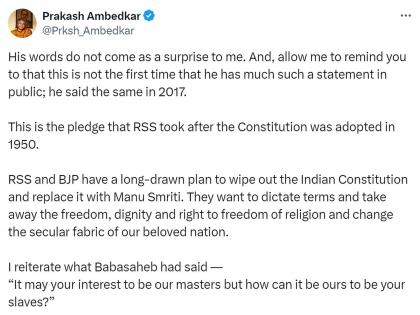प्रकाश आंबेडकर म्हणाले की, भारतीय संविधान हटवून त्याजागी मनुस्मृती आणण्याच्या आरएसएस आणि भाजपच्या दीर्घकालीन योजनेचा हा भाग आहे. त्यांना हुकूमशाही आणायची आहे आणि स्वातंत्र्य, प्रतिष्ठा आणि धर्म स्वातंत्र्याचा अधिकार हिरावून घ्यायचा आहे. तसेच आपल्या राष्ट्राच्या धर्मनिरपेक्षतेची रचना बदलवायची आहे असा आरोप त्यांनी केला.