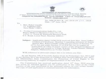 "बाल लैंगिक प्रतिबंधक कायदा" (पॉक्सो) नुसार या आरोपींन वर गुन्हा दाखल केलेला असतानाही या कायद्यातील "कलम 23" अन्वये अशा प्रकारचा कुठलाही व्हिडिओ अथवा फोटो प्रसारीत करणे गुन्हा म्हंटले आहे. याही कायद्याचे राहुल गांधी यांच्या कडून उल्लंघन झालेले असल्याने या विषयात स्पष्टीकरण देण्यासाठी राहुल गांधी यांना महाराष्ट्र बाल हक्क संरक्षण आयोगाने नोटीस बजावली आहे. राहुल गांधी यांना नोटीस बजावल्या मुळे एकच खळबळ माजली असुन, राहुल गांधी यांच्यावर "पॉक्सो" कायद्या नुसार गुन्हा दाखल करण्याची मागणी जोर धरत आहे.