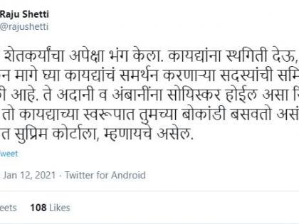 स्वाभिमानी शेतकरी संघटनेचे नेते राजू शेट्टी यांनीही या निर्णयावर आक्षेप नोंदवला आहे. "न्यायालयाने शेतकऱ्यांचा अपेक्षाभंग केला. कायद्यांना स्थगिती देऊ, आंदोलन मागे घ्या. कायद्याचं समर्थन करणाऱ्या सदस्यांची समिती नेमलेली आहे. ते अदानी व अंबानींना सोयिस्कर होईल असा रिपोर्ट देतील, तो कायद्याच्या स्वरुपात तुमच्या बोकांडी बसवतो असंच कदाचित सुप्रीम कोर्टाला म्हणायाचे असेल", असं ट्विट राजू शेट्टी यांनी केलं आहे.