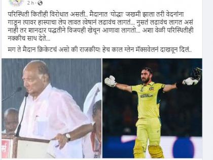 फेसबूकवर २०१९ च्या निवडणुकीच्या प्रचारावेळी शरद पवारांनी पावसात भिजत घेतलेल्या सभेचा आणि काल विस्फोटक फलंदाजी करणाऱ्या मॅक्सवेलचा फोटो शेअर करत रोहित पवार म्हणाले की, परिस्थिती कितीही विरोधात असली, मैदानात ‘योद्धा’ जखमी झाला तरी वेदनांना गाडून त्यावर हास्याचा लेप लावत त्वेषानं लढावंच लागतं. नुसतं लढावंच लागतं असं नाही तर शानदार पद्धतीने विजयही खेचून आणावा लागतो. अशा वेळी परिस्थितीही नक्कीच साथ देते. मग ते मैदान क्रिकेटचं असो की राजकीय! हेच काल ग्लेन मॅक्सवेलनं दाखवून दिलं.