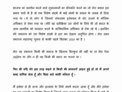 पुढे ते म्हणतात, "त्यामुळे त्या संदर्भाशिवाय माझ्या वक्तव्याकडे बघणे चुकीचे होईल. माझे विधान महाराष्ट्र निवडणूक २०२४ च्या खूप आधी सप्टेंबर २०२४ मधील आहे. माझे विधान कोणत्याही समाजाविरोधात अजिबात नव्हते. माझा तसा कोणताही उद्देश नव्हता, ना कोणत्याही प्रकारचा फतवा होता", असा खुलासा सज्जाद नोमानी यांनी केला आहे.