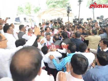 मुंबई - विधानभवनाच्या पायऱ्यांवर आज सत्ताधारी आणि विरोधकांमध्ये राडा झाला. विधानसभेच्या पायऱ्यांवर विरोधकांकडून सत्ताधाऱ्यांविरोधात घोषणाबाजी आणि आंदोलने याआधीही केली जात होती. विरोधक आमदार विधानसभेच्या पायऱ्यांवर येण्याआधीच शिंदे गटातील आमदारांनी त्याठिकाणी येऊन विरोधकांविरोधात घोषणाबाजी सुरू केली. त्यानंतर विरोधी पक्षातील आमदार विधानसभेच्या पायऱ्यांजवळ येताच त्यांनीही सत्ताधाऱ्यांविरोधात घोषणाबाजीला सुरुवात केली. त्यानंतर दोन्ही गटातील आमदारांमध्ये शाब्दिक बाचाबाजी झाली. पुढे याचं रुपांतर धक्काबुक्की आणि शिवीगाळ करण्यातही झालं.