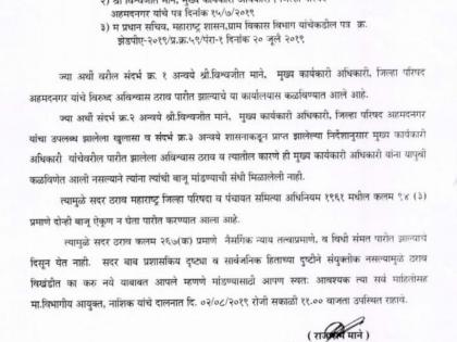 अहमदनगर जिल्हा परिषदेने मुख्य कार्यकारी अधिकाऱ्यांना बाजू मांडण्याची संधी न देताच त्यांचेविरुद्ध अविश्वास ठराव आणला होता