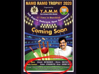 डोंबिवलीत युवा आशापुरा मित्र मंडळातर्फे नमो रमो ट्राफी क्रिकेट स्पर्धा आयोजित करण्यात आली आहे. मात्र या स्पर्धेत गुजराती मारवाडी आणि कच्छी भाषिक खेळाडूंनाच सहभागी होता येणार आहे अशी अट घालण्यात आली आहे. या बॅनरचे फोटो सध्या सोशल मीडियावर व्हायरल होत असून संताप व्यक्त करण्यात येत आहे. यात महत्वाची बाब म्हणजे बॅनरवर डोंबिवलीचे आमदार रविंद्र चव्हाण यांचा फोटो असल्यामुळे विरोधकांनी देखील भाजपावर टीका केली आहे.