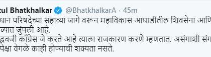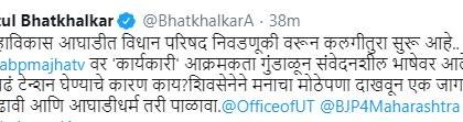 विधान परिषदेची निवडणूक बिनविरोध लढवण्यासाठी शिवसेना आणि राष्ट्रवादी काँग्रेस उत्सुक आहे. मात्र काँग्रेसने दोन उमेदवार उभे केल्यामुळे निवडणूक अटळ आहे. उद्धव ठाकरेंनी या संबंधित मंत्री आणि काँग्रेसचे नेते बाळासाहेब थोरात यांच्याशी चर्चा केली असल्याचे सांगितले जात आहे. तसेच काही मराठी वृत्तावाहिनींनुसार काँग्रेस दोन जागा लढवण्यास ठाम राहिल्यास मी निवडणूक लढवणार नाही, असा निरोप देखील उद्धव ठाकरे यांनी काँग्रेसला दिल्याचे देखील सांगण्यात येत आहे. मात्र याबाबत शिवसेनेकडून अद्याप अधिकृत दुजोरा देण्यात आलेला नाही. यावर आता भाजपाने मुख्यमंत्री उद्धव ठाकरेंना टोला लगावला आहे.