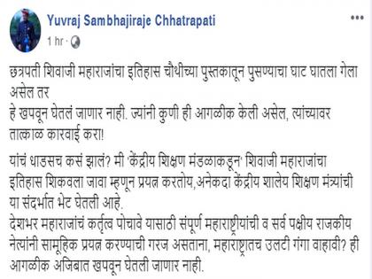 दरम्यान, यांचं धाडसच कसं झालं? मी 'केंद्रीय शिक्षण मंडळाकडून' शिवाजी महाराजांचा इतिहास शिकवला जावा म्हणून प्रयत्न करतोय, अनेकदा केंद्रीय शालेय शिक्षण मंत्र्यांची या संदर्भात भेट घेतली आहे. देशभर महाराजांचं कर्तृत्व पोचावे यासाठी संपूर्ण महाराष्ट्रीयांची व सर्व पक्षीय राजकीय नेत्यांनी सामूहिक प्रयत्न करण्याची गरज असताना, महाराष्ट्रातच उलटी गंगा वाहावी? ही आगळीक अजिबात खपवून घेतली जाणार नाही अशा शब्दात छत्रपती संभाजी महाराजांनी इशारा दिला आहे.
