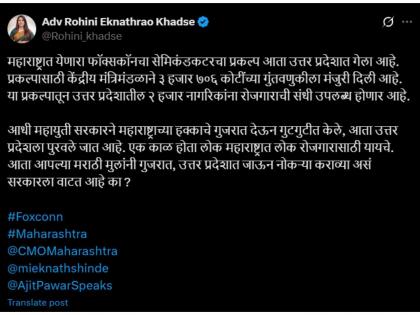 "महाराष्ट्रात येणारा फॉक्सकॉनचा सेमिकंडकटरचा प्रकल्प आता उत्तर प्रदेशात गेला आहे. प्रकल्पासाठी केंद्रीय मंत्रिमंडळाने ३ हजार ७०६ कोटींच्या गुंतवणुकीला मंजुरी दिली आहे. या प्रकल्पातून उत्तर प्रदेशातील २ हजार नागरिकांना रोजगाराची संधी उपलब्ध होणार आहे. आधी महायुती सरकारने महाराष्ट्राच्या हक्काचे गुजरात देऊन गुटगुटीत केले, आता उत्तर प्रदेशला पुरवले जात आहे. एक काळ होता लोक महाराष्ट्रात लोक रोजगारासाठी यायचे. आता आपल्या मराठी मुलांनी गुजरात, उत्तर प्रदेशात जाऊन नोकऱ्या कराव्या असं सरकारला वाटत आहे का?" असा संतप्त सवाल रोहिणी खडसे यांनी विचारला आहे.