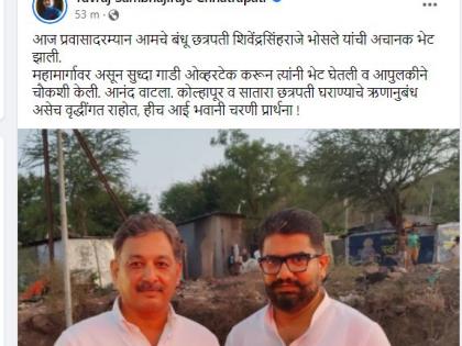 या भेटीची माहिती संभाजीराजे छत्रपती यांनी सोशल मीडियावरून दिली आहे. या संदर्भात फेसबूकवर शेअर केलेल्या पोस्टमध्ये संभाजीराजे छत्रपती म्हणाले की, आज प्रवासादरम्यान आमचे बंधू छत्रपती शिवेंद्रसिंहराजे भोसले यांची अचानक भेट झाली. महामार्गावर असून सुध्दा गाडी ओव्हरटेक करून त्यांनी भेट घेतली व आपुलकीने चौकशी केली. आनंद वाटला. कोल्हापूर व सातारा छत्रपती घराण्याचे ऋणानुबंध असेच वृद्धींगत राहोत, हीच आई भवानी चरणी प्रार्थना!