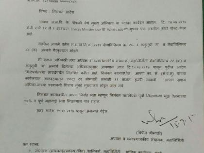 मुंबई, दि. 16 - जल विद्युत केंद्र पोफळी येथील मुख्य अभियंता पदावर कार्यरत असणाऱ्या व्ही.एम. खोकले या अधिकाऱ्यास अश्लील मेसेस पाठवला म्हणून तडकाफडकी निलंबित करण्यात आले आहे. निलंबनाचे आदेश काढण्यात आले असून, त्यांची बाजू ऐकून घेऊन पुढील कारवाई करण्यात येईल, असे लोकमतशी बोलताना बिपीन श्रीमाळी यांनी सांगितले. ‘एनर्जी मिनिस्टर लाईव्ह’ नावाचा व्हॉटसअपचा एक ग्रुप ऊर्जामंत्री चंद्रशेखर बावनकुळे यांनी तयार केला आहे. त्यात राज्यभरातील वरिष्ठ अधिकारी सहभागी आहेत.