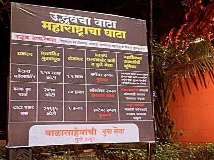 बाळासाहेबांची युवासेनेने पुणे, डोंबिवली यासह अनेक शहरात बॅनर्स लावले आहेत. त्यात उद्धवचा वाटा, महाराष्ट्राचा घाटा असा खोचक टोला लगावत राज्यातील प्रकल्प बाहेर जाण्याला महाविकास आघाडी सरकार कारणीभूत असल्याचं म्हटलं आहे. या बॅनरवर लिहिलंय की, उद्धव ठाकरेंच्या नेतृत्वात महाविकास आघाडी सरकारने महाराष्ट्राचे केलेले नुकसान. त्यात प्रकल्प, प्रस्तावित गुंतवणूक, रोजगार, प्रकल्प राज्याबाहेर कधी व कुठे गेला आणि महाविकास आघाडीची भूमिका असं तक्ता देत मांडले आहे.