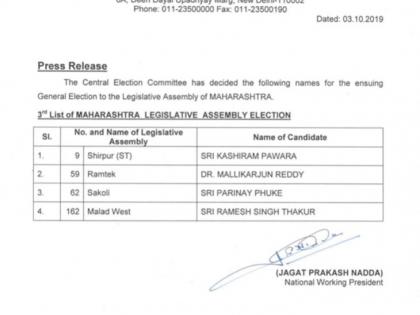 भाजपाने विधानसभा निवडणुकांसाठी तिसरी उमेदवारांची यादी जाहीर केली आहे. तिसऱ्या यादीत भाजपाने 4 उमेदवारांची नावे जाहीर केली आहेत.