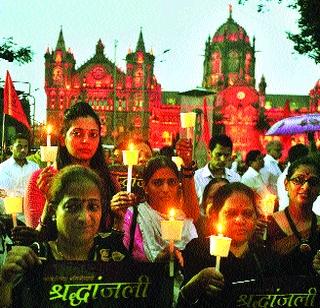 मुंबई- कोपर्डी घटनेतील पीडितेला श्रद्धांजली वाहण्यासाठी मुंबईकर गुरुवारी सायंकाळी सीएसटी येथील अमर जवान ज्योतीजवळ एकवटले होते. महिलांनी मेणबत्ती पेटवून पीडितेला श्रद्धांजली वाहिली. ही दुर्दैवी घटना होऊन एक वर्ष उलटल्यानंतरही आरोपी मोकाट असल्याने सकल मराठा समाजाचे समन्वयक वीरेंद्र पवार यांनी सरकारवर टीका केली.पवार म्हणाले की, खटला जलदगती न्यायालयात असून, एक वर्ष उलटल्यानंतरही बचाव पक्षाचे वकील वेळकाढूपणा करत आहेत. त्यामुळे सरकारने जलदगती न्यायालयातील खटल्यांना मुदत घालून देण्याची गरज आहे. ९ आॅगस्टच्या मुंबईतील महामोर्चात या प्रकरणाचा जाब विचारला जाईल, असेही त्यांनी सांगितले.