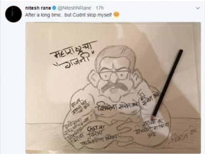 काँग्रेसचे आमदार आणि स्वाभिमान संघटनेचे अध्यक्ष नितेश राणे यांनी शिवसेनेचे पक्षप्रमुख उद्धव ठाकरे यांची एका व्यंगचित्राद्वारे टर उडविली आहे