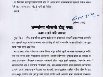 अण्णा हजारे यांच्या उपोषणाची सरकारने दखल घ्यावी. अण्णांचे प्राण महत्त्वाचे असून सरकारने त्यांच्या जीवाशी खेळू नये असे आवाहन शिवसेना पक्षप्रमुख उद्धव ठाकरे यांनी केले आहे. अण्णा हजारे यांच्या उपोषणाचा पाचवा दिवस असून त्यांची प्रकृती खालावत असल्याबद्दल उद्धव ठाकरे यांनी चिंता व्यक्त केली. पंतप्रधानांनी अण्णांच्या 'आमरण उपोषणास' शुभेच्छा देणारे पत्र पाठवावे हा प्रकार संतापजनक, तितकाच हास्यास्पद असल्याचे उद्धव ठाकरे यांनी म्हटले आहे.