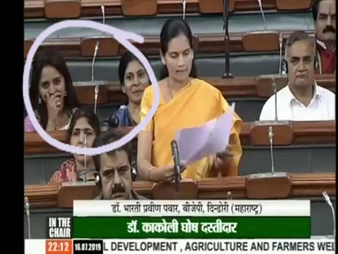 महाराष्ट्रात कमी पाऊस पडला आहे. त्यामुळे केंद्र सरकारने महाराष्ट्राला मोठा निधी उपलब्ध करुन द्यावा. तसेच, येथील शेतकऱ्यांसाठी उपाययोजनाही कराव्यात, अशी मागणी पवार यांनी केली. तसेच जलशक्ती मंत्रालयाबद्दल मी पंतप्रधान नरेंद्र मोदींचे आभार मानते. महाराष्ट्रात शेतकऱ्यांना कर्जमाफी दिल्याबद्दल मी मुख्यमंत्री देवेंद्र फडणवीस यांचेही आभार मानते, असे भारती पवार यांनी म्हटले. भारती पवार यांनी मुख्यमंत्र्याचे नाव घेताच, बीडच्या खासदार आणि पंकजा मुंडे यांच्या भगिनी प्रितम मुंडे आणि भाजपाचे ज्येष्ठ नेते एकनाथ खडसे यांच्या सुनबाई खासदार रक्षा खडसे यांना हसूच आवरले नाही. म्हणजेच, मुख्यमंत्र्यांनी कर्जमाफी केली, असे म्हणताच या दोन्ही महिला खासदारांनी चक्क बेंचखाली डोके नेऊन हसू आवरण्याचा प्रयत्न केला. मात्र, या दोन्ही महिला खासदारांची हास्यास्पद कृती कॅमेऱ्यात कैद झाली असून याचा व्हिडीओत सोशल मीडियावर मोठ्या प्रमाणावर शेअर होत आहेत.