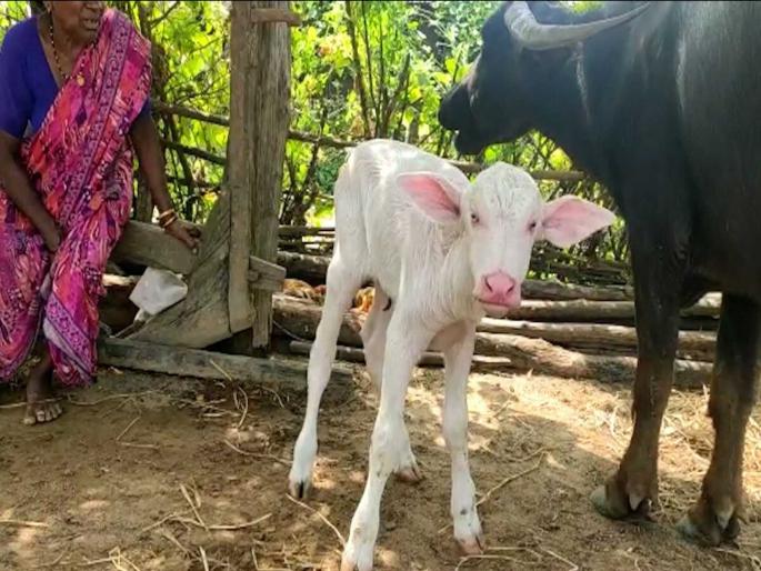 सोलापूर : रेडकाच्या अंगावर किंवा डोक्यावर एखादं-दुसरा पांढरा ठिपका असणारे म्हशीचे रेडकू अनेक ठिकाणी आहेत, मात्र गायीच्या वासराप्रमाणेच अगदी पांढऱ्या शुभ्र रेडकाला म्हशीने जन्म दिला आहे. मोहोळ तालुक्यातील वडवळ येथील अल्पभूधारक शेतकरी राजकुमार कोटीवाले हे शेतीसोबतच पशुपालनाचा व्यवसाय करतात. त्यांच्या म्हशीने पांढऱ्या रेडकाला जन्म दिला आहे.