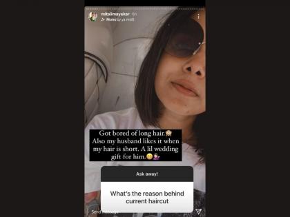 इंस्टाग्रामवर मिताली मयेकरला एका चाहत्याने विचारले होते की, सध्याचा हेअरकट करण्यामागे काय कारण होते?, त्यावर मितालीने इंस्टाग्राम स्टोरीवर उत्तर दिले की, मी मोठ्या केसांना कंटाळले होते. तसेच माझ्या नवऱ्याला माझे हेअर शॉर्ट असताना आवडायचे. त्यामुळे त्याला मी लग्नाचे माझ्याकडून छोटेसे गिफ्ट दिले आहे.