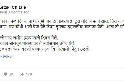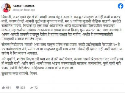 त्यात तिने म्हटले आहे की, ''३ वर्षाच्या मुलाची बौद्धिक पातळी असलेले स्वघोषित मावळे, शिवाजी हा एक शब्द ओळखतात आणि महाराजांच्या शिकवणीला फाट्यावर मारून, महाराजांच्या नावावर राजकारण करायचा पोकळ विनोद सुरू करतात. बरं, अशा वागण्यानी आपण आपली लायकी दाखवून देतोय हे त्यांच्या लक्षात येत नाहीच. अर्थात हे कळण्यासाठीही नखाएवढी अक्कल लागतेच म्हणा!''