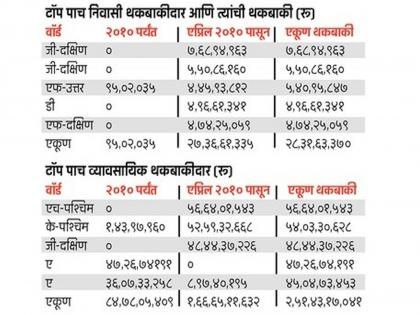 पाच वॉर्डांत निवासी वर्गवारीत पाच निवासी आणि पाच व्यावसायिक आस्थापनांनी पालिकेला २०१० पासून रखडवले आहे. पाच वॉर्डात मिळून निवासी वर्गवारीत एकूण २८,३१,६३,३७० एवढी थकबाकी आहे. त्यात २०१० पूर्वीची ९५,०२,०३५ आणि एप्रिल २०१० सालापासून २७,३६,६१,३३५ एवढी थकबाकी आहे. जी-दक्षिण विभागात निवासी वर्गवारीतील सर्वाधिक थकबाकी ७,६८,९४,९६३ एवढी आहे.