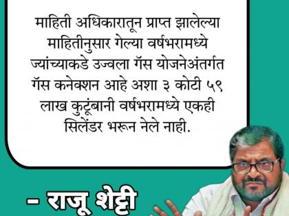 या उज्ज्वला योजनेंतर्गत एकूण ८ कोटी BPL कुटूंबांना मोफत LPG कनेक्शन उपलब्ध करण्याचे उदिष्ट आहे. त्यापैकी 6 कोटीपेक्षा अधिक नागरिकांना या योजनेच्या माध्यमातून कनेक्शन देण्यात आले आहे. मात्र, गतवर्षात या योजनेच्या माध्यमातून सिलेंडर भरणारांची संख्या कमी झाल्याचे दिसून येते. कारण, माहिती अधिकारात मिळालेल्या माहितीनुसार, गेल्या वर्षभरात उज्ज्वला गॅस योजनेंतर्गत असलेल्या गॅस कनेक्शनधारकांपैकी 3 कोटी 59 लाख कुटुंबांपैकी एकानेही सिलेंडर भरून नेले नाही. यासंदर्भात स्वाभिमानी शेतकरी संघटनेचे नेते राजू शेट्टी यांनी माहिती दिली आहे. त्यांनी, आपल्या सोशल मीडिया अकाऊंटवरुन यासंदर्भात पोस्ट केली आहे.