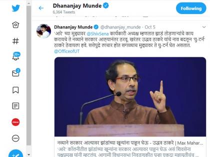 शिवसेनेनं सत्तेत असतानाही कारशेडमधील झाडं तोडण्यास विरोध केला होता. एवढी झाडं तोडून झाल्यानंतरही शिवसेना पक्षप्रमुखांनी सत्ता आल्यावर बघू, असं म्हटल्याचा हवाला देत शिवसेनेवर कुरघोडी केली. कार्यकारी अध्यक्ष म्हणतात, झाडं तोडणाऱ्यांचे काय करायचे ते नव्याने सरकार आल्यानंतर ठरवू. खरं तर उद्धव ठाकरे यांचे नाव बदलून 'यू-टर्न' ठाकरे ठेवायला हवे. सत्तेपुढे लाचार होत सगळ्याच मुद्द्यावर ते यू-टर्न घेत असतात, अशी टीकाही धनंजय मुंडेंनी केली आहे.