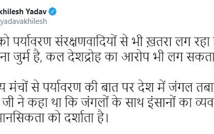यावर यादव यांनी ट्विट करत नाराजी व्यक्त केली. आज वृक्ष वाचविणे गुन्हा ठरत आहे, उद्या देशद्रोही असल्याचा आरोपही करतील. भाजपाला पर्यावरण वाचविणाऱ्या लोकांपासून धोका वाटत आहे. आंतरराष्ट्रीय मंचावर एकीकडे पर्यावरणाच्या गोष्टी करतात आणि देशात वृक्षतोड करतात. गांधींनी सांगितले होते, की जंगलांसोबतचा मानसाचा व्यवहार त्याची मानसिकता दाखवितो, असे यादव यांनी म्हटले आहे.