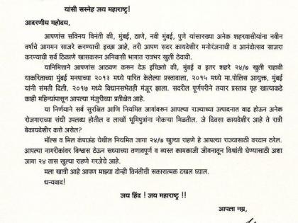 ''मुंबई, ठाणे, नवी मुंबई आणि पुणे यांसारख्या अनेक शहरवासीयांना नवीन वर्षाचे आगमन साजरे करण्याची इच्छा आहे. या पार्श्वभूमीवर कायदेशीर मनोरंजनाची आणि आनंदोत्सव साजरा करण्याची सर्व ठिकाणं विशेषतः अनिवासी भागातील ठिकाणे रात्रभर खुली ठेवावीत'', असे आदित्य ठाकरे यांनी आपल्या पत्रात नमुद केले आहे.