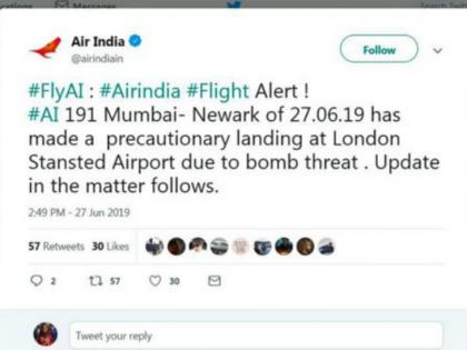 एअर इंडियाच्या बोईंग 777 फ्लाईट ए-191 ने मुंबईहून अमेरिकेच्या नेवार्कला उड्डाण केले होते. इंग्लंडच्या संरक्षण मंत्रालयाने सांगितले की, ब्रिटिश फायटर जेट्सनी सुरक्षा लक्षात घेऊन एअर इंडियाचे विमान स्टॅनफोर्ड विमानतळावर सुरक्षित उतरविण्यात आले. ट्वीटनुसार गुरुवारी सकाळी ही धमकी देण्यात आली होती. यानंतर हे विमान अमेरिकेच्या मार्गावरून वळविण्यात आले आणि इंग्लंडच्या विमानतळावर उतरविण्यात आले. हे विमान पोलिसांच्या सुरक्षेमध्ये सकाळी 10.15 वाजता उतरविण्यात आले. मात्र, तपासणीवेळी कोणतीही बॉम्बसदृष्य वस्तू आढळून आली नाही. यामुळे विमान पुन्हा नेवार्कसाठी रवाना झाले.