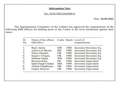 नवी दिल्ली - केंद्र सरकारच्या कॅबिनेट अपॉइंटमेंट कमिटीनं ९ ज्येष्ठ आयएएस अधिकाऱ्यांची भारत सरकारच्या सचिवपदी नियुक्ती केली आहे. त्यात मध्य प्रदेशातील १९८९ बॅचचे आशिष उपाध्याय, महाराष्ट्रातील राजीव जलोटा, मुंबई महापालिका आयुक्त इक्बाल सिंह चहल, बिहारचे अमृतलाल मीना, ओडिसाहून नितीन चंद्र, श्रीनिवास गुडे आणि संजीव चोपडा, पश्चिम बंगालहून सुब्रतो गुप्ता, पंजाब रवनीत कौर यांचा समावेश आहे.