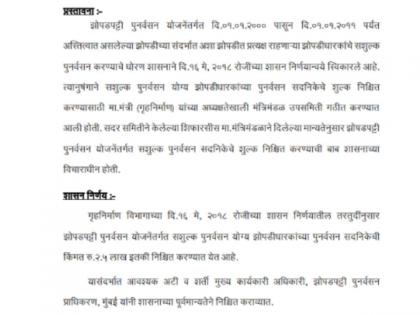 दरम्यान, गृहनिर्माण विभागाच्या १६ मे २०१८ च्या शासन निर्णयातील तरतुदींनुसार पात्र झोपडपट्टीधारकांना २.५ लाखांत घर देण्याचा निर्णय घेण्यात आला.