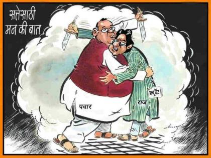 मातोश्रीवरील अमित शहा आणि उद्धव ठाकरे यांच्या बहुचर्चित भेटीवर राज ठाकरेंनी व्यंगचित्रातून निशाणा साधला होता. उद्धव ठाकरे आणि अमित शहा यांची गळाभेट राज यांनी व्यंगचित्रात दाखवली होती. हे दोन्ही नेते एकमेकांच्या पाठीत खंजीर खुपसण्याच्या तयारीत असल्याचं व्यंगचित्र राज यांनी रेखाटलं होतं. राज यांच्या या व्यंगचित्राला आता भाजपानं प्रत्युत्तर दिलं आहे. 'सत्तेसाठी मन की बात' या शीर्षकाखाली भाजपाकडून एक व्यंगचित्र व्हायरल करण्यात आलं आहे. यामध्ये शरद पवार आणि राज ठाकरे गळाभेट घेत असून ते एकमेकांच्या पाठीत खंजीर खुपसण्याच्या तयारीत असल्याचं या व्यंगचित्रात दाखवण्यात आलं आहे. राज यांनी त्यांच्या व्यंगचित्रात उद्धव ठाकरेंच्या खिशात राजीनामा दाखवला होता. उद्धव ठाकरेंकडून वारंवार दिल्या जाणाऱ्या राजीनाम्याची धमकीची राज यांनी खिल्ली उडवली होती. आता भाजपानं व्हायरल केलेल्या व्यंगचित्रात राज यांच्या खिशात ब्लू प्रिंट दाखवण्यात आली आहे.