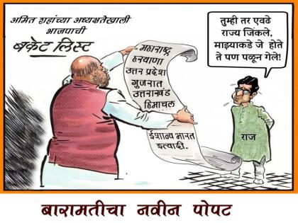 भाजपाच्या व्यंगचित्रात अमित शहांच्या हातात एक भलीमोठी यादी दाखवण्यात आली आहे. या यादीत महाराष्ट्र, हरयाणा, उत्तर प्रदेश, गुजरात, उत्तराखंड, हिमाचल अशा राज्यांचा उल्लेख आहे. भाजपानं शहांच्या नेतृत्वाखाली जिंकलेल्या राज्यांचा उल्लेख यादीत आहे. तर अमित शहांच्या समोर राज दीन अवस्थेत उभे आहेत. 'तुम्ही तर एवढे राज्य जिंकले, माझ्याकडे जे होते ते पण पळून गेले,' असं राज ठाकरे बोलताना दिसत आहेत. अमित शहांच्या अध्यक्षतेखाली भाजपाची बकेट लिस्ट असं शीर्षक या व्यंगचित्राला देण्यात आलं आहे. या व्यंगचित्राखाली 'बारामतीचा नवीन पोपट' असं लिहिण्यात आलं आहे.