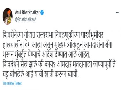 भाजपाचे नेते अतुल भातखळकर यांनी ट्विट मुख्यमंत्री उद्धव ठाकरेंवर निशाणा साधला आहे. शिवसेनेच्या गोटात राज्यसभा निवडणुकीच्या पार्श्वभूमीवर हालचालींना वेग आला असून मुख्यमंत्र्यांकडून आमदारांना बॅगा भरून मुंबईत येण्याचे आदेश देण्यात आले आहेत. शिवबंधन सैल झालं की काय?, असा सवाल उपस्थित करत आमदार मतदानाला जाण्यापूर्वी ते घट्ट बांधलेलं आहे, याची खात्री करून घ्यावी, असा टोलाही अतुल भातखळकर यांनी लगावला आहे.