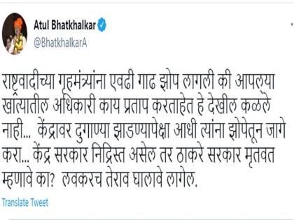 भाजपाचे नेते अतुल भातखळकर ट्विट करत म्हणाले की, राष्ट्रवादीच्या गृहमंत्र्यांना एवढी गाढ झोप लागली की, आपल्या खात्यातील अधिकारी काय प्रताप करताहेत हे देखील कळले नाही. केंद्रावर दुगाण्या झाडण्यापेक्षा आधी त्यांना झोपेतून जागे करा. केंद्र सरकार निद्रिस्त असेल तर ठाकरे सरकारला मृतवत म्हणावे का?, असा सवाल उपस्थित करत लवकरच तेरावं घालावे लागेल, असा टोला देखील अतुल भातखळकर यांनी लगावला आहे.