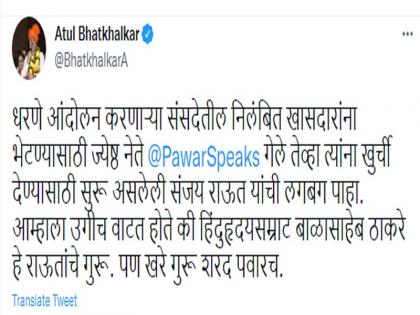 धरणे आंदोलन करणाऱ्या संसदेतील निलंबित खासदारांना भेटण्यासाठी ज्येष्ठ नेते गेले तेव्हा त्यांना खुर्ची देण्यासाठी सुरू असलेली संजय राऊत यांची लगबग पाहा. आम्हाला उगीच वाटत होते की, हिंदुहृदयसम्राट बाळासाहेब ठाकरे हे राऊतांचे गुरू. पण खरे गुरू शरद पवारच, असा टोला अतुल भातखळकर यांनी लगावला आहे.