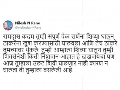 निलेश राणे यांनी ट्विटमध्ये म्हटले आहे की, रामदास कदम तुम्ही संपूर्ण वेळ राणेंना शिव्या घालून ठाकरेंना खूष करण्यासाठी घालवला आणि तेच ठाकरे तुमच्यावर थुंकले. तुम्ही आम्हाला शिव्या घालून तुम्ही शिवसेनेशी किती निष्ठावान आहात हे दाखवायचा, पण आज तुम्हाला उलट शिवी घालणार नाही कारण न घालता ती तुम्हाला बसलेली असल्याचे म्हणत निलेश राणे यांनी रामदास कदम यांच्यावर टीका केली आहे.
