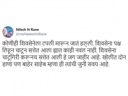 सोनिया गांधी यांनी सांगितलेली संपूर्ण माहिती आम्ही उद्धव ठाकरे यांना दिली. त्यावेळी उद्धव ठाकरे यांनी घटनेच्या बाहेर जाणार नाहीत. घटना हीच शिरोधार्य मानून घटनेच्या चौकटीत सरकार चालणार, अशी भूमिका घेतली त्यामुळे हे सरकार स्थापन झालं असल्याचे अशोक चव्हाण यांनी सांगितले. यावर खोलीत दोन हाणा पण बाहेर साहेब म्हणा ही त्यांची जुनी सवय आहे असं ट्विट करत निलेश राणे यांनी उद्धव ठाकरेंना टोला लगावला आहे.