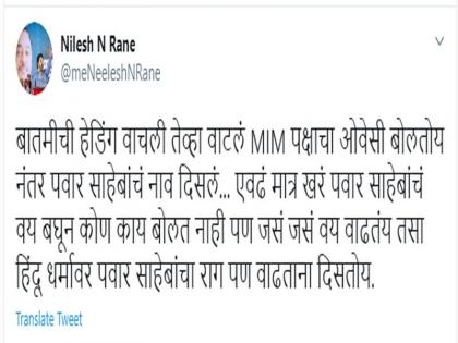 निलेश राणे ट्विट करत म्हणाले की, एवढं मात्र खरं आहे, शरद पवारांचं वय बघून कोण काय बोलत नाही पण जसं जसं वय वाढतंय तसा हिंदू धर्मावर त्यांचा राग पण वाढताना दिसत आहे.