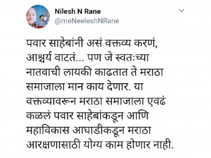 भाजपाचे नेते निलेश राणे ट्विट करत म्हणाले की, शरद पवार यांनी असं वक्तव्य करणं म्हणजे आर्श्चर्य वाटतं. पण जे स्वत:च्या नातवाची लायकी काढतात ते मराठा समाजाला काय मान देणार, असा टोला निलेश राणे यांनी लगावला आहे. तसेच या वक्तव्यावरून मराठा समाजाला एवढं कळलं की शरद पवारांकडून आणि महाविकास आघाडीकडून मराठा आरक्षणासाठी योग्य काम होणार नाही, अशी टीका निलेश राणे यांनी केली आहे.