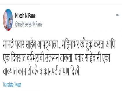 निलेश राणे ट्विट करत म्हणाले की, मानलं पवार साहेब आपल्याला.. महिनाभर कौतुक करता आणि एका दिवसात वर्षभराची उतरून टाकता. पवार साहेबांनी एका वाक्यात कान टोचले, अशी टीका निलेश राणे यांनी उद्धव ठाकरेंवर केली आहे.