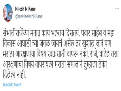 संभाजीराजेंच्या या भेटीनंतर भाजपाचे नेते नारायण राणे यांचे सुपुत्र आणि माजी खासदार निलेश राणे यांनी एक ट्विट केलं आहे. या ट्विटमध्ये निलेश राणे म्हणाले की, संभाजीराजेंच्या मनात काय भलंतच दिसत आहे. पवार साहेब व महाविकास आघाडी सरकारच्याजवळ जायचं असेल, तर खुशाल जावं, पण मराठा आरक्षणाचा विषय स्वतःसाठी वापरू नका. राजे, वाटेल तसा आरक्षणाचा विषय वापरायला मराठा समाजाने तुम्हाला ठेका दिलेला नाही, असं निलेश राणे यांनी यांनी म्हटलं आहे.