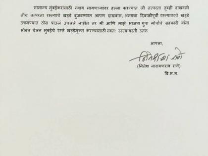 सामान्य मुंबईकरांसाठी न्याय मागणाऱ्यांवर हल्ला करण्यात जी तत्परता तुम्ही दाखवली तीच तत्परता रस्त्यांचे खड्डे बुजवण्यात आपण दाखवाल, अन्यथा दिवाळीपूर्वी रस्त्यावरचे खड्डे उचलण्यात ठोस पाऊलं उचलले नाहीत तर मी आणि माझे भाजपा युवा मोर्चाचे सहकारी यांना सोबत घेऊन मुंबईचे रस्ते खड्डेमुक्त करण्यासाठी स्वत: रस्त्यावरती उतरू, असा इशारा नितेश राणे यांनी या पत्रातून दिला आहे.