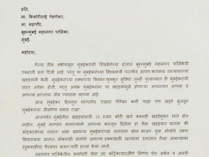 गेल्या तीस वर्षांपासून मुंबईकरानी शिवसेनेच्या हातात बृहन्मुंबई महानगर पालिकेची एकहाती सत्ता दिली आहे. परंतु या मुंबईकरांच्या विश्वासाची परतफेड आपण कायमच रस्त्यावरच्या खड्ड्यांनी केली. मुंबईकरांच्या हक्काच्या किमान मुलभूत सुविधा तुम्ही पुरवाव्यात ही मुंबईकरांची रास्त अपेक्षा होती, परंतु अनेक मुंबईकरांना या खड्ड्यांमुळे होणाऱ्या अपघातात आपला व आपल्या आप्तांचा जीव गमवावा लागला आहे.