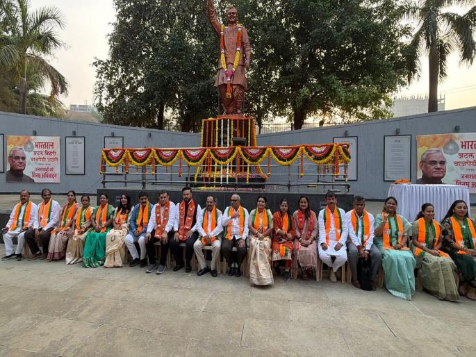 BMC Elections News: भारतीय जनता पक्ष, उत्तर मुंबईतील भाजपच्या सर्व नवनिर्वाचित २७ नगरसेवकांनी आज सकाळी कांदिवली( पूर्व),हायवेच्या आकुर्ली मेट्रो स्टेशन समोरील भारतरत्न, माजी पंतप्रधान स्व. अटल बिहारी वाजपेयी यांच्या स्मृतीस्थळी दर्शन घेऊन त्यांच्या विचारांना अभिवादन केले.