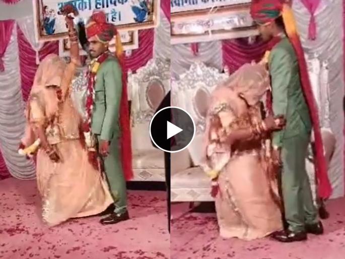 Viral Video:सोशल मीडियावर कधी पोट धरून खळखळून हसवणारे तर कधी नेटकऱ्यांच्या भावनांना स्पर्श करणारे व्हिडीओ व्हायरल होत असतात. असाच एक नवविवाहित जोडप्याचा व्हिडीओ सोशल मीडियावर तुफान व्हायरल होताना दिसतोय. लग्न हा प्रत्येकाच्या आयुष्यातील खास क्षण असतो. हा खास दिवस आठवणीत राहावा अशी अनेकांची इच्छा असते. अशाच एका लग्नाचा व्हिडीओ चर्चेचा विषय बनला आहे. व्हायरल होणाऱ्या या व्हिडीओमध्ये नववधू एका गाण्यावर थिरकत आहे. तिचा उत्साह शिगेला पोहोचल्याचे दिसत आहे. घुमर गाण्यावर नाचताना अचानक या नववधुचा तोल जातो आणि ती स्टेजवर कोसळते. हे सगळं नवरदेवच्या समोर घडत असुनही तो नवरदेव मात्र शांतपणे स्टेजवर उभा असल्याचे चित्र आहे. त्यातून नवरदेवाचा हा खोडसाळपणा समोर आला आहे. त्यामुळे हा नवरदेवाला ट्रोल करण्यात आले आहे.