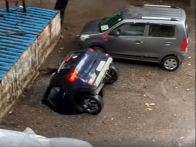 क्रेनने कार काढली बाहेरसोसायटीने आरसीसी करून अर्धी विहीर झाकली होती. त्यावर रहिवासी वाहने पार्क करीत असत. आरसीसी पावसामुळे खचून त्यावर पंकज मेहता यांनी पार्क केलेली कार विहिरीत पडली. यात काेणी जखमी झाले नाही किंवा मनुष्यहानी झाली नाही. क्रेनच्या मदतीने रात्री साडेनऊच्या दरम्यान कार बाहेर काढण्यात आली.- नागराज मजगे, प्रभारी पोलीस निरीक्षक, घाटकोपर वाहतूक विभाग