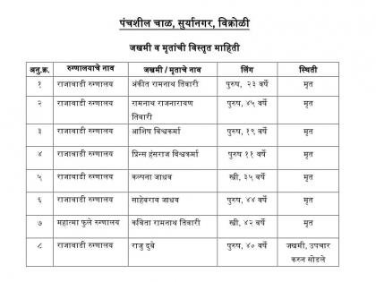विक्रोळी येथील दुर्घटनेत ७ जणांचा मृत्यू झाला असून, एक जण जखमी झाला आहे. अंकित तिवारी (२३), रामनाथ राजनारायण तिवारी (४५), आशिष विश्वकर्मा (१९), प्रिन्स हंसराज विश्वकर्मा (११), कल्पना जाधव (३५), साहेबराव जाधव (४४), कविता रामनाथ तिवारी (४२) अशी येथील मृतांची नावे आहेत.