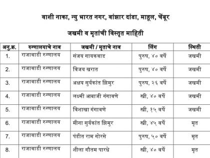 चेंबुर येथील दुर्घटनेत १६ जणांचा मृत्यू झाला असून, ५ जण जखमी झाले आहेत. १६ मृतांपैकी रात्री ऊशिरापर्यंत १४ जणांची ओळख पटली होती तर २ जणांची ओळख पटली नव्हती. मीना झिमुर (४५), पंडित राम गोरसे (५०), शीला गौतम पारधे (४०), शुभम गौतम पारधे (१०), श्रृती गौतम पारधे (१५), मुकेश जयप्रकाश अग्रहारी (२५), जिजाबाई तिवारी (५४), पल्लवी दुपारगडे (४४), खुशी सुभाष ठाकुर (२), सुर्यकांत रविंद्र झिमुर (४७), उर्मिला ठाकूर (३२), छाया पंडित गोरसे (४७), अपेक्षा सुर्यकांत झिमुर (२०), प्राची पंडित गोरसे (१५) अशी मृतांची नावे असून, दोघांची ओळख पटलेली नाही.